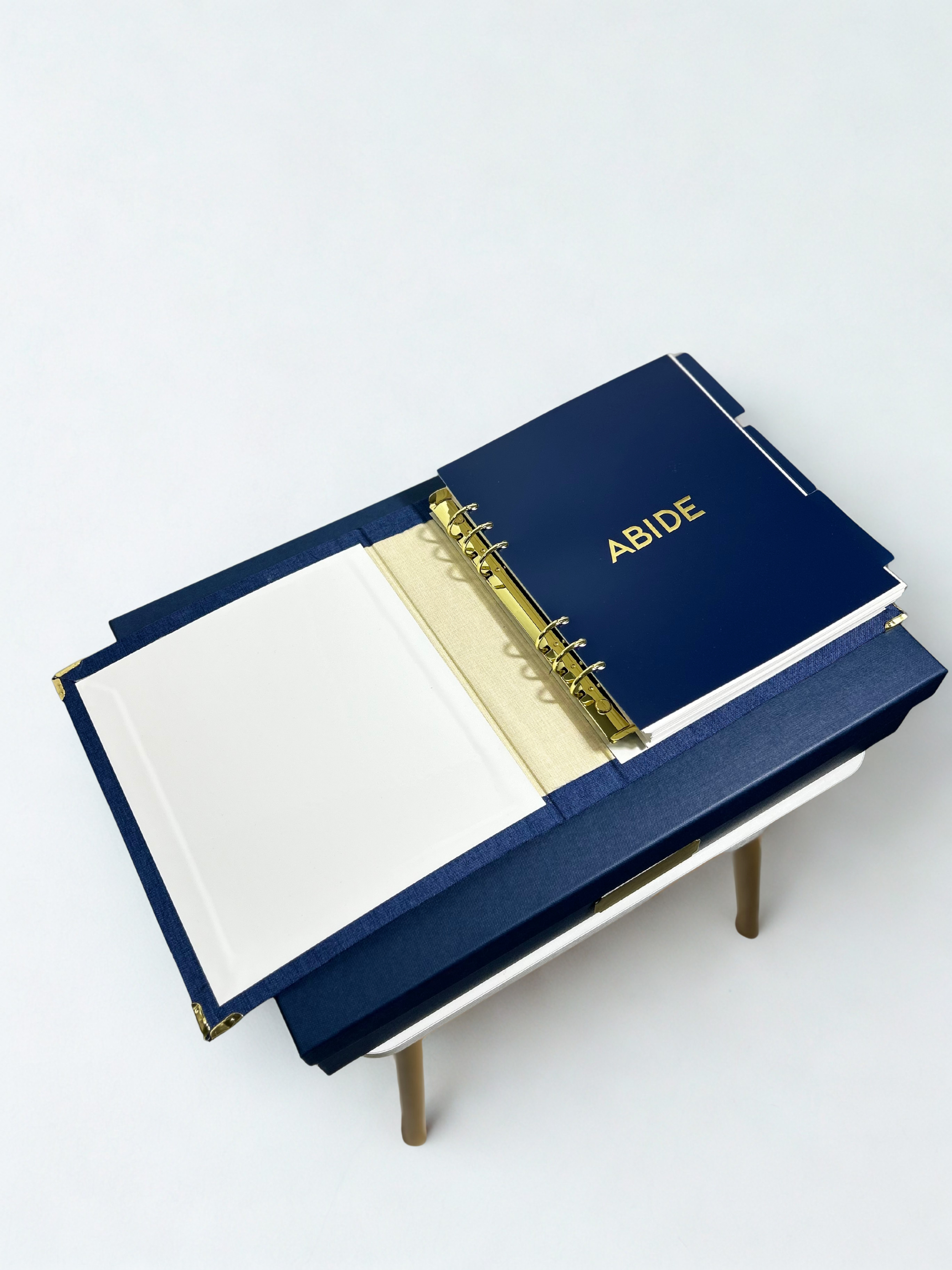 Custom 10x8.5in linen binder with gold hardware + reinforced metal corners